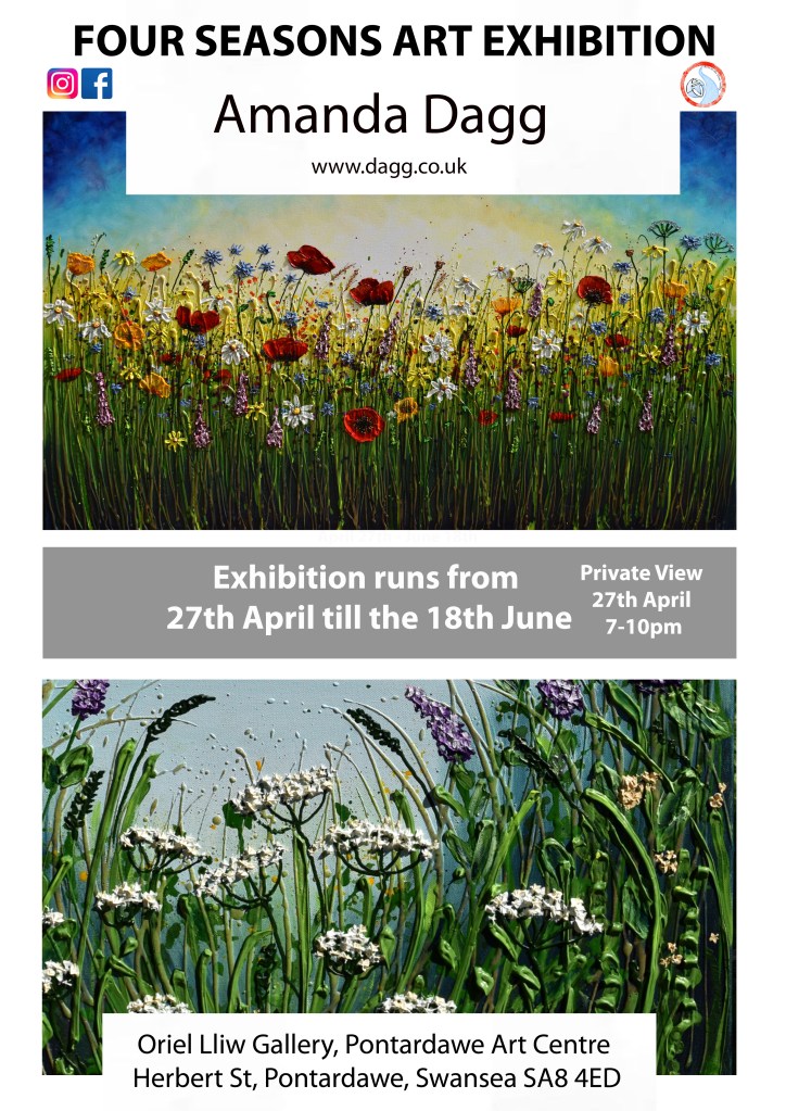 Private View: Friday 27th April 7pm – 10pm. ‘Four Seasons’ – Is an installation of paintings inspired by the seasons in South Wales. Amanda Loves the natural beauty here in Wales and has painted a selection of new paintings to celebrate this. Her inspiration comes from local places she visits. This exhibition showcases not only the work of Amanda Dagg but also includes selected works from Arts in the Tawe Valley members in the shop area. The exhibition runs until the 18th June