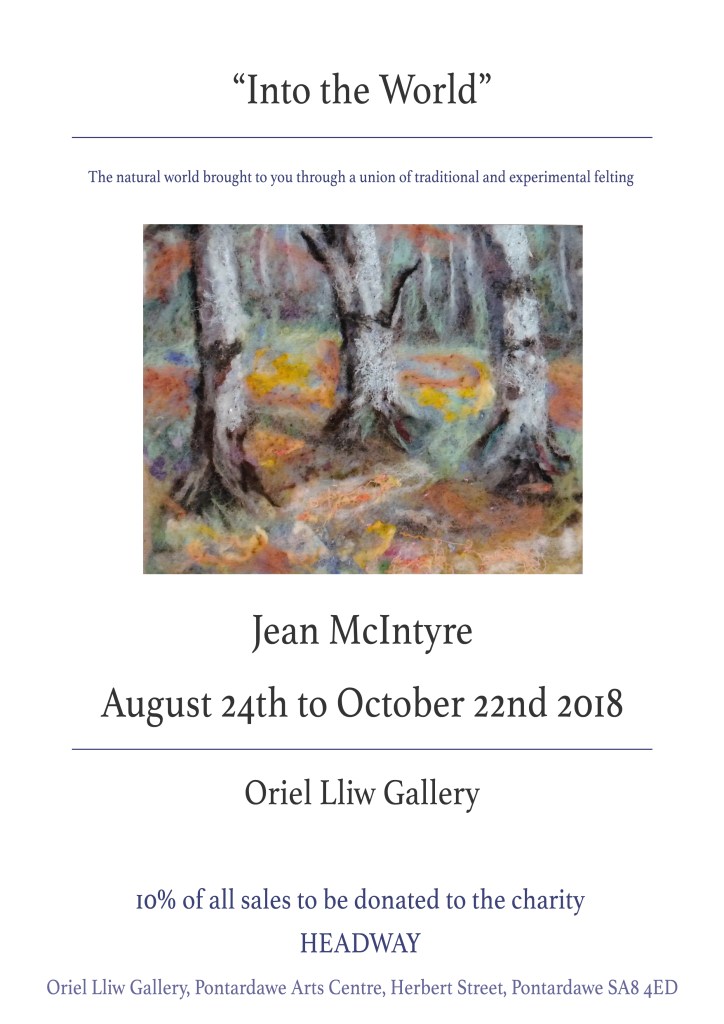 ‘Into the World’ – Jean McIntyre Aug 24th – Oct 22nd July 28, 2018March 12, 2019taweartsweek ‘Into the World’ an exploration of the natural world brought to you with the union of both traditional and experimental felt making. 10% of all proceeds go to the charity ‘HEADWAY’ Private View August 24th 7pm all welcome. This slideshow requires JavaScript. Share this: Click to share on X (Opens in new window) X Click to share on Facebook (Opens in new window) Facebook Like Loading... Related