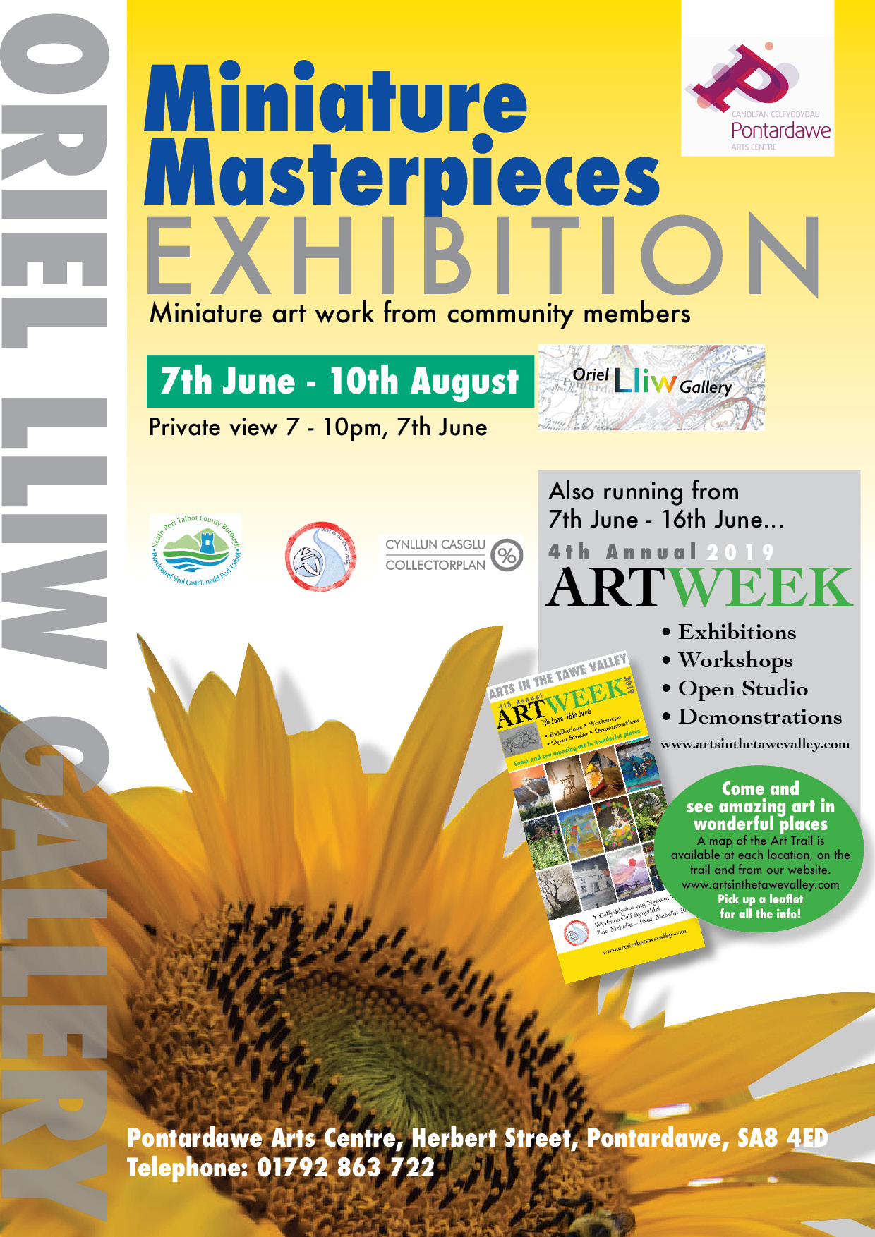 artsweek ’19rev9 2A work of miniature masterpieces from community members. All pieces are no bigger than A6. This is also the launch of Arts in the Tawe Valley’s Annual Art Week Private View 7-10pm Friday 7th June 2019. All welcome.